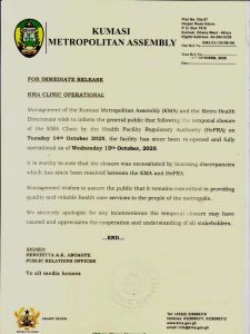 The Kumasi Metropolitan Assembly has confirmed that its clinic is now fully operational following a temporary closure due to licensing issues. The Health Facilities and Regulatory Agency shut down the KMA Clinic along with nine other health facilities in the Ashanti Region on Tuesday, October 1...